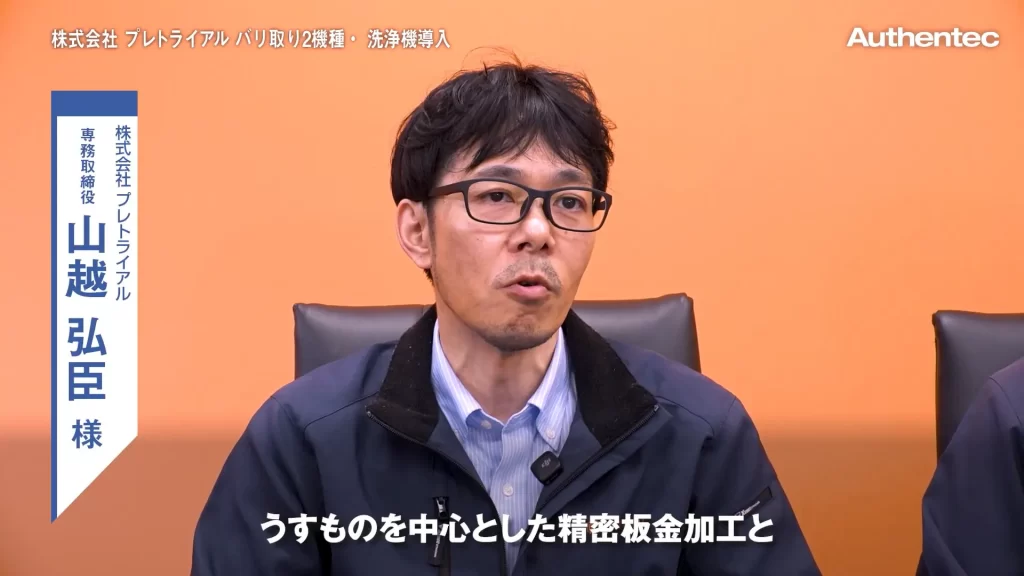 インタビュアー本日は、株式会社プレトライアル 専務取締役 山越様と、 取締役兼工場長の柴田様にお話を伺います。まずは山越様から御社の会社紹介をお願いします。